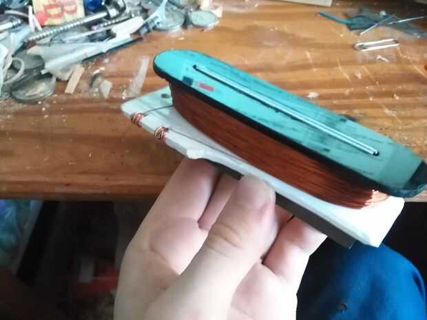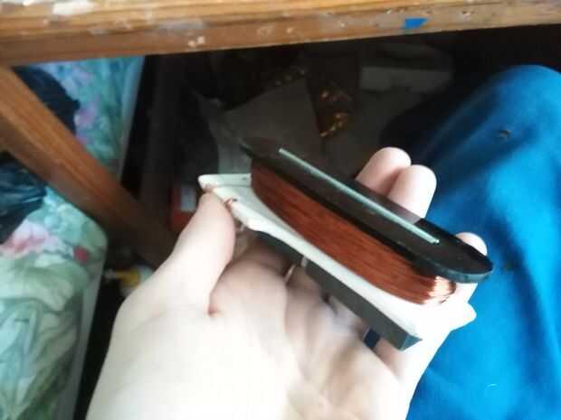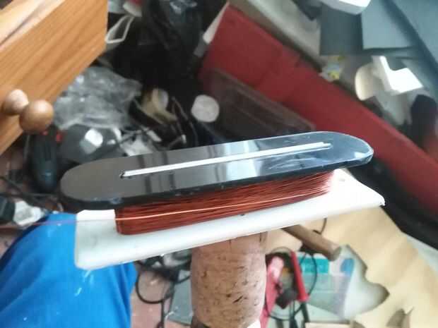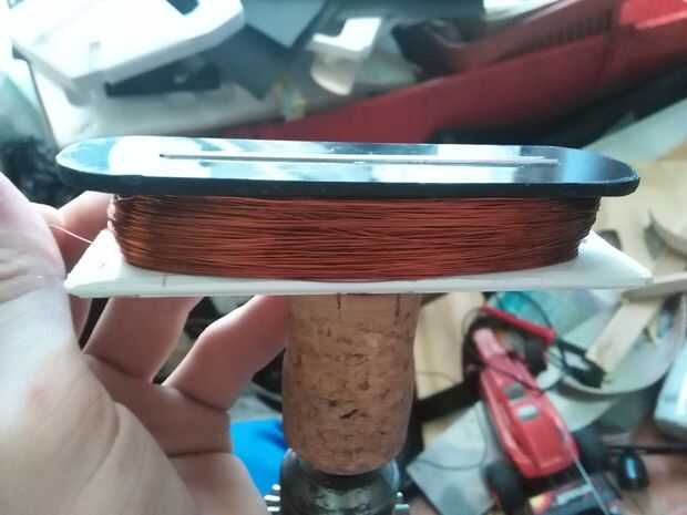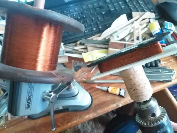 Luego, terminé la bobina de un carrete grande de alambre de cobre que tenía, utilizando el taladro. Tomó mucho tiempo porque lo hice lentamente. El cobre no debe ser tirado demasiado apretado o encajará y tendrás que hacer una nueva recolección. No importa la dirección de la bobina con una sola camioneta como esta. Antes de enrollar, con cinta adhesiva alrededor de 100 mm del cable apagado al lado de la camioneta donde se fuera del camino y se puede soldar más tarde.