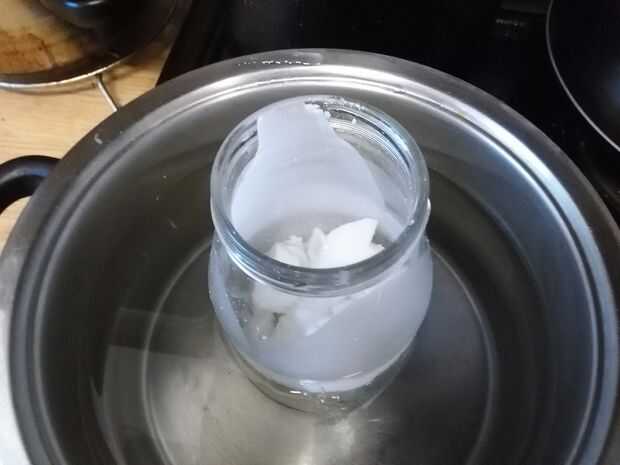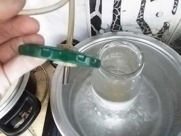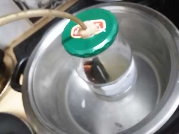 He usado un frasco de mayonesa con un agujero en la tapa y un tubo de goma pegado en este agujero para que los bordes eran herméticos. Me rompió dos velas de parafina básico y poner los trozos de cera en el tarro. Luego poner el frasco en una olla de agua y hervir hasta que toda la cera en el tarro había licuado. Puse la pastilla dentro del frasco, asegurándose de que los cables no entran en la cera. Atornillar la tapa y aspira el aire lo mejor que pude con mi boca (ya que no tengo un compresor), y algunas burbujas salieron de la bobina, que es una buena señal porque eso significaba cera fue siendo absorbida en donde fue que el aire.