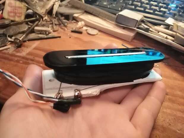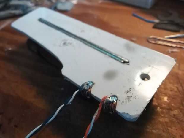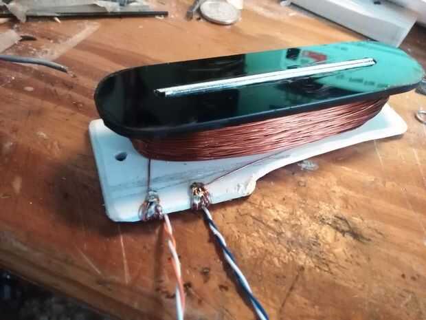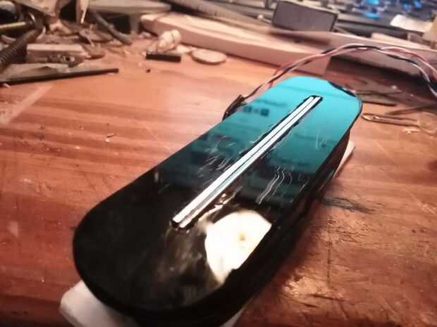 Luego, se pegan los dos imanes en la parte inferior de la pastilla. Se debe pegar allí lo suficientemente bien por sí mismos al acero, pero una vez que están en su lugar a que te recomiendo que uses una pistola de pegamento caliente evitar que se mueve fuera de lugar o separar si se cae la guitarra.