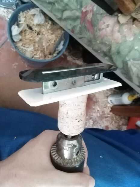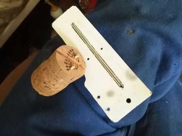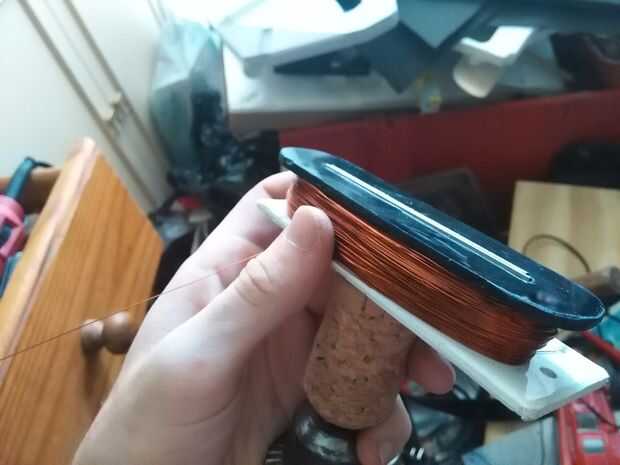 Luego, viene la bobina. Hice un rig básico utilizando un corcho y palillos de dientes para pegar temporalmente el marco recogido a un taladro, para hacer el proceso de bobinado ir por mucho más rápido.