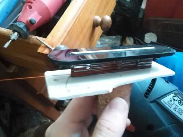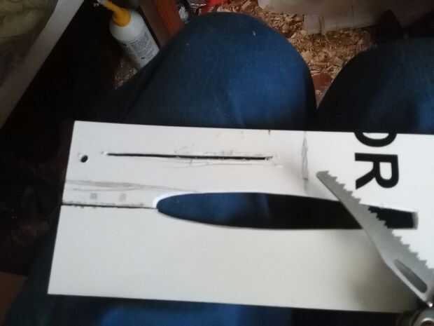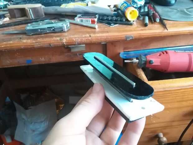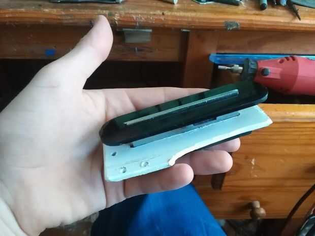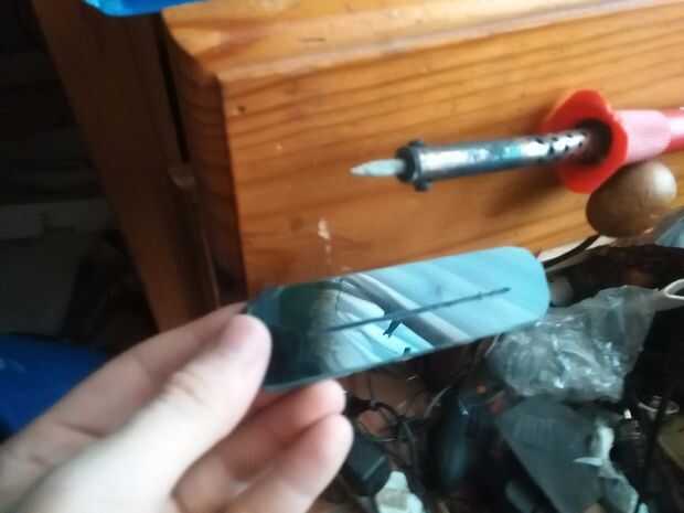 Luego cortar las dos piezas de plástico del marco de la recolección, el interior blanco y visible negro. Las ranuras en el centro de las piezas de plástico son para que las placas de acero a ser atrapada y pegada, por lo que deben ajustarse firmemente. Utilicé un soldador y una sierra para cortar las piezas de plástico. La parte interna del plástico (uno blanco) tiene un lado extendida de modo que los agujeros se pueden hacer a través del cual se suelde los cables posteriormente. Los agujeros deben ser por lo menos 7 mm de donde va a ser la parte exterior de la bobina de cobre. Ahora hacen estos agujeros. Unir las partes, para que formen una sección como esta: "l--l" las placas de acero deben quedar al ras con el plástico en ambos extremos.