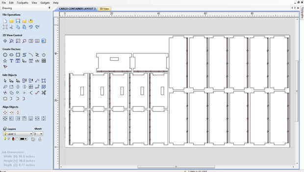 Una vez que el archivo Ai se hizo trajo en V talla pro, un programa de rutas para el Shopbot (CNC router.) Este programa me permitió designar perfil cortes y los cortes de bolsillos (hendiduras poco profundas que permiten que las piezas que se enclavijan)