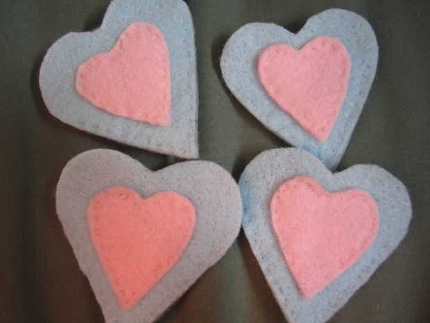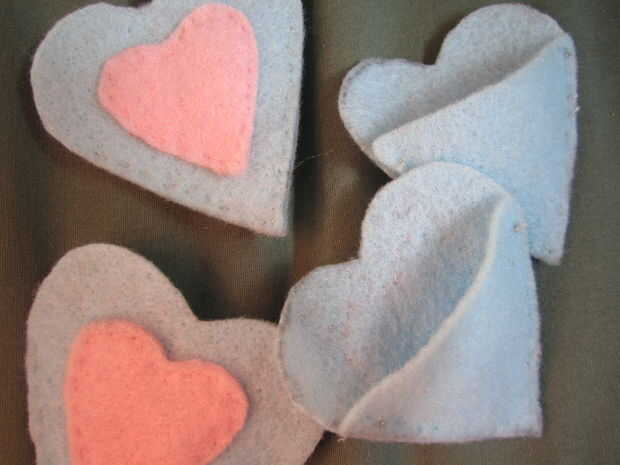 5) una vez hayas cosido todo el azul y rosa pares juntos, voltearlas y par encima de uno de los triángulos con el dorso de cada una de las piezas de corazón azul y rosa y mano cose en el borde del corazón azul. Yo no coser todo el camino hasta la parte superior del triángulo (donde se abre el bolsillo) para permitir dar más--dejó libre a escasos milímetros.