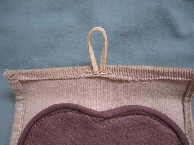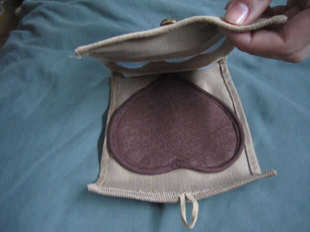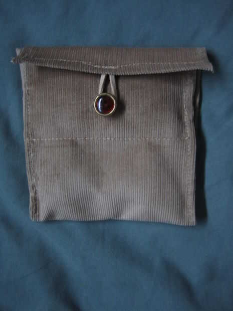 16) centro el botón aproximadamente 1 1/4 de pulgada abajo de lo que será la parte superior de la bolsa (esto es aproximadamente 1/2 una pulgada hacia abajo desde la parte superior de la bolsa inferior) y mano coser, asegurándose de no coser el botón en el bolsillo!