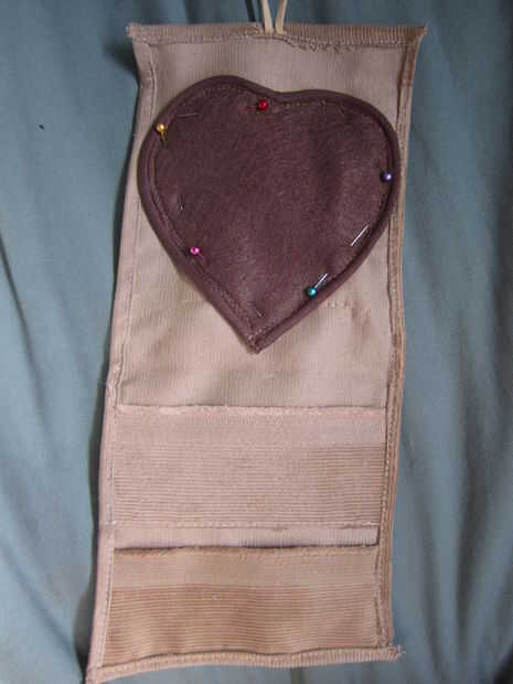 22) centro el corazón marrón en el interior de la pana, en el área encima de los bolsillos, pero por debajo de los 3/4 en la solapa superior que tiene el bucle botón de cuero. Precisar (ver imagen). Antes de coser, dale la vuelta y ver si la costura superpone la presilla. Si todavía permitirán su correa de ajuste, máquina de coserlo, tratando de coincidir cuidadosamente esta costura con el que se crea cuando cosen en el pipping (si hiciste esto)--no cose en la tubería.