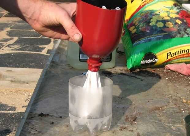 Mi idea original era cortar la parte superior de una botella de 2 camada y poner una maceta de terracota estándar dentro. El 2 litros sería el depósito de agua y un trozo de algodón que camiseta podría actuar como la mecha. Entonces me di cuenta, bueno, si usted voltee la parte superior de la de 2 litros tiene una cavidad muy bonito poner la mezcla de rellenado en y un agujero en la parte inferior (el original cuello y apertura) para ejecutar la mecha a través. Después de pensar nosotros estaban apagados a las razas.