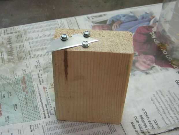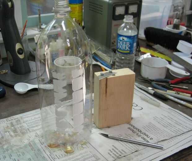 -Es necesario ser capaz de cortar una botella de 2 litros por la mitad y mientras que puede ser un salvaje y corte ondulado, buena y recta y plana es una buena cosa. Decidí hacerlo varios plantadores configura una herramienta de producción. Es un corte de 2 x 4 a la altura de 5.25". De eso me taladrar agujeros piloto y enroscada una lámina de cuchillo de utilidad. Haciendo girar el 2 litros alrededor de la hoja he podido conseguir una marca incluso y sobre todo el corte realizado. Empezar a vendar para la última parte y que he utilizado la cuchilla xacto.