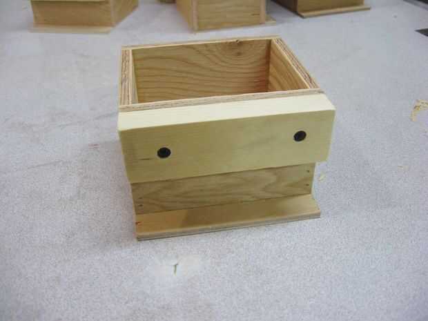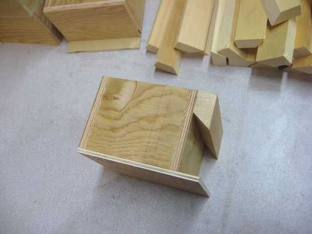 Los tacos fueron Unidos a las cajas como se muestra en las fotos. Viró en el lugar con unos clavitos y luego añadió un par de tornillos de 1" a través de la parte trasera para asegurarlos más segura. Los agujeros para estos se pretaladran y avellanados para que los tornillos apenas hundida debajo de la superficie posterior de las calas y no lo hizo sobresalir en la abertura de la caja.