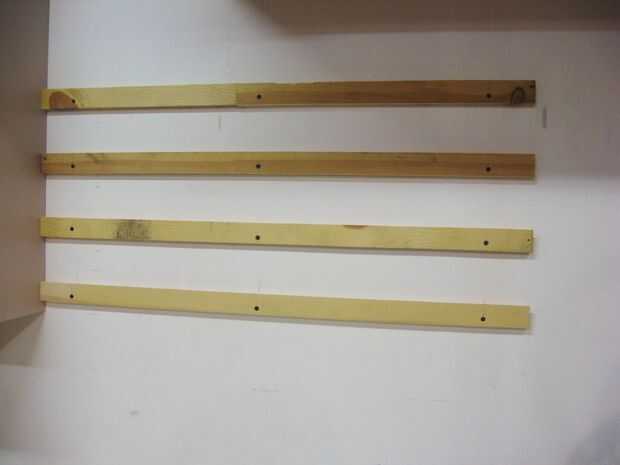 Las cuatro tiras de grapa de 37" estaban aseguradas a la pared con tornillos. Las ubicaciones de los montantes en la sección de la pared de donde fui colgando estos no podrían haber sido más perfectas. Los agujeros para los tornillos eran agujeros y avellanados.