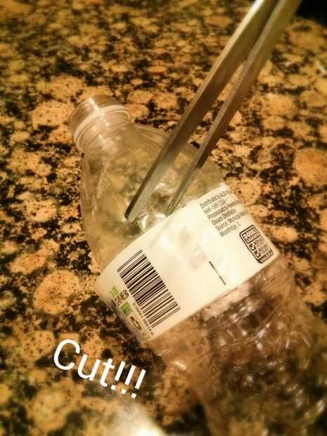 Inicia cortando un par de pulgadas de la llanta de botellas. o por encima de la etiqueta de las aguas. Corte alrededor de la botella.