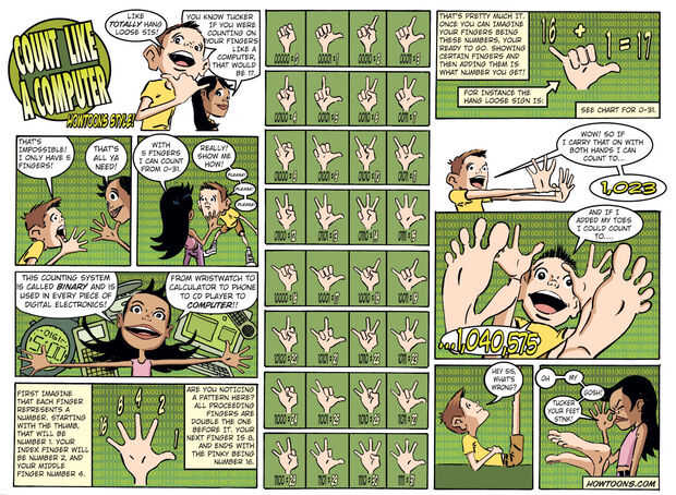 dar una descripción general de la Instructablethis es mi segundo binario instructable. Esto va en ecuaciones matemáticas en binario. Sección 1 muestra cómo contar binario con las manos, mientras que la sección 2 le muestra en forma escrita.Sólo una n