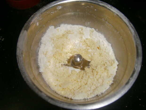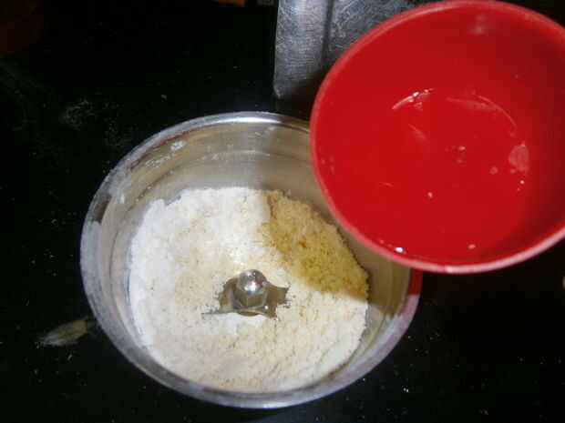 Añadir la mantequilla y el proceso hasta que la mezcla es grumosa unos 15 segundos. Agregue el agua (empezar con 1/4 taza) hasta que es suficiente para que la masa es gruesa y a agruparse cuando se pellizca.