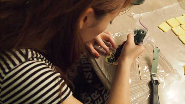 Añadir gel de color negro con un palillo en el glaseado real, hasta obtener un color bastante oscuro.