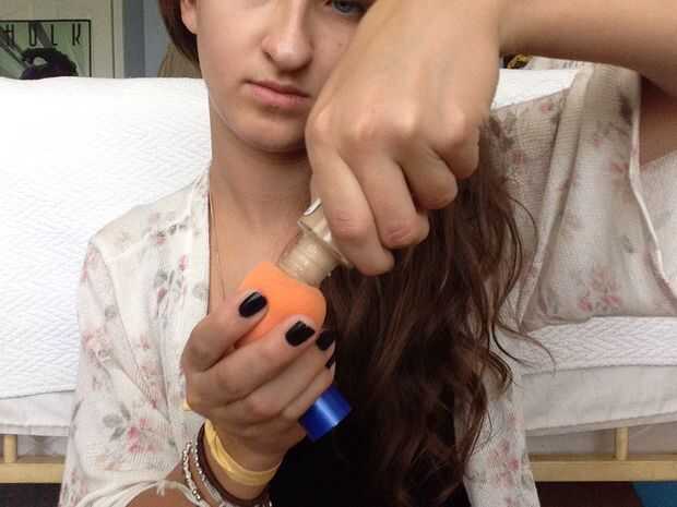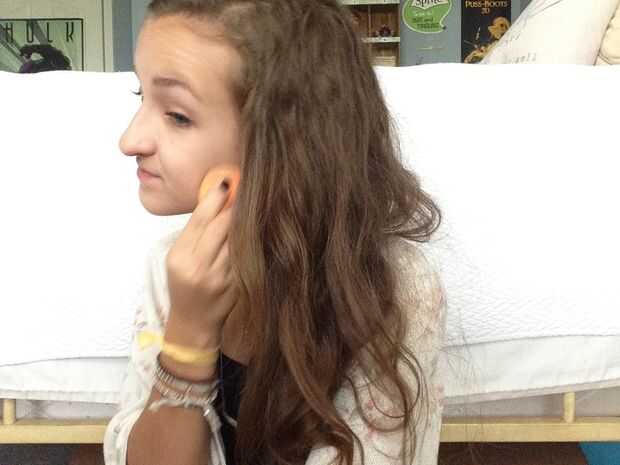 3. Gire la botella una esponja suave de la mezcla y aplique un poco en las mejillas, nariz, barbilla y frente. Utilice el lado redondo de la esponja para mezclar las mejillas y la frente y el borde plano para mezclar la nariz y alrededor de los ojos.