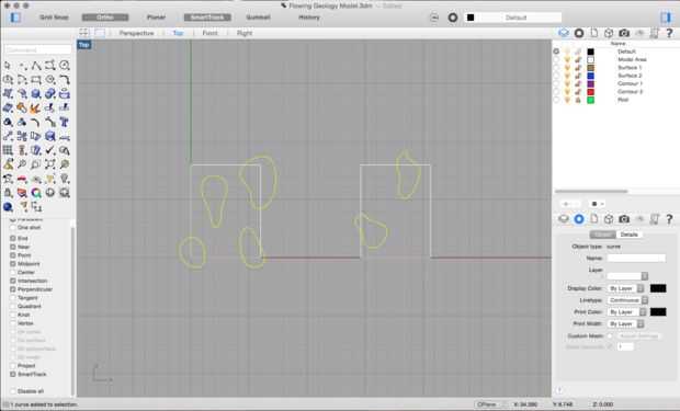 Dibujar dos rectángulos para delinear los dos terrenos a realizarse. Dentro de los límites, establecer las curvas de la topografía. Experimenté con varias formas simples en diferentes lugares para realmente obtener un contraste entre los dos materiales.
