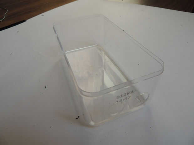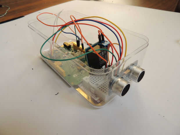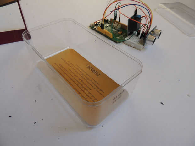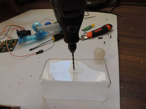 Tomé la caja de chocolates (sin chocolates) y abre dos agujeros para los "ojos" del sensor ultrasónico.