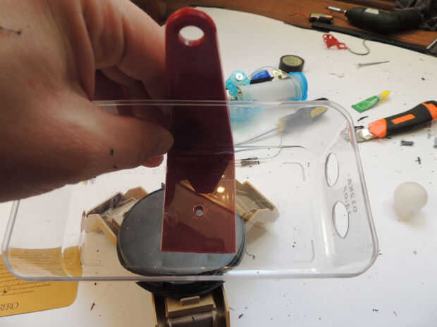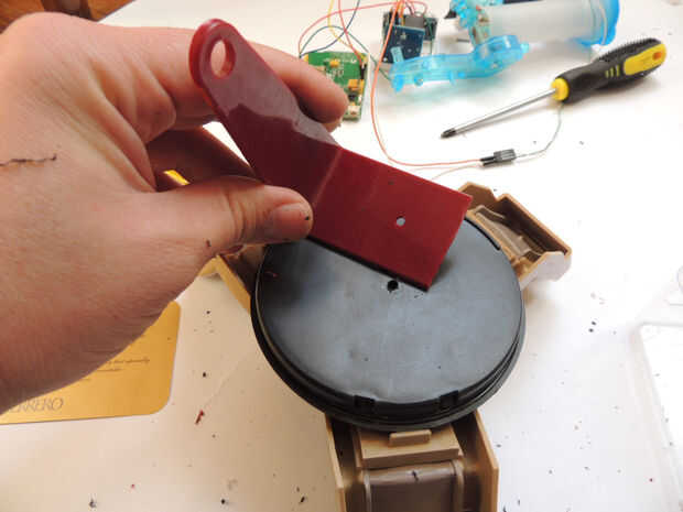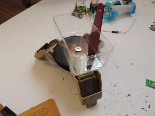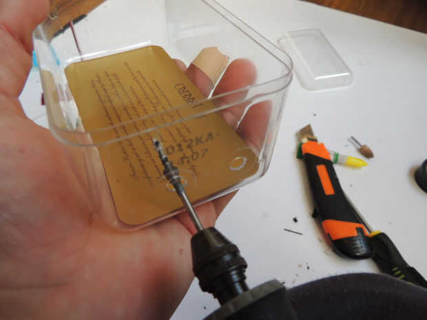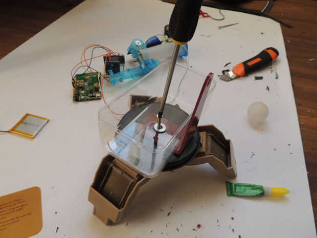 Entonces abrí un orificio en el centro de la caja, el centro de la base de la torreta y uno de los lados del ángulo plástico, y fijarse con un tornillo.
