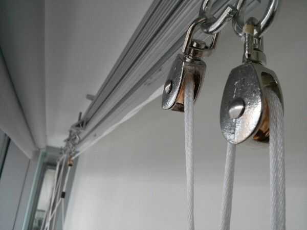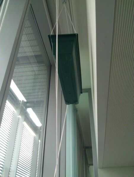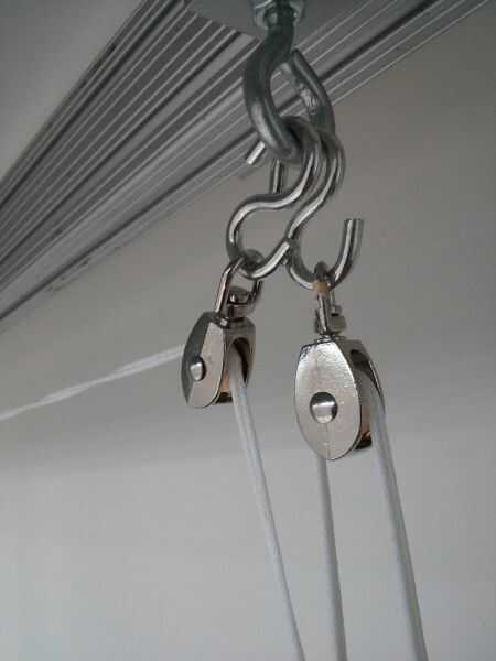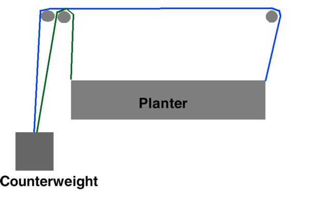 Las cuerdas desde el lado de la maceta más el contrapeso suben a la polea hasta ahora de lado, en el techo a una polea de lado cerca y luego hasta el contrapeso. Las cadenas laterales cerca ir hasta su propia polea y luego directamente hacia abajo para el contrapeso. (véase la ilustración). Una vez roscado, usar algunos clips binder para las cuerdas de cada lado juntos sobre un pie por encima de la jardinera, por lo que son juntos desde allí para arriba y por lo tanto menos probable deslizar la rueda de la polea.