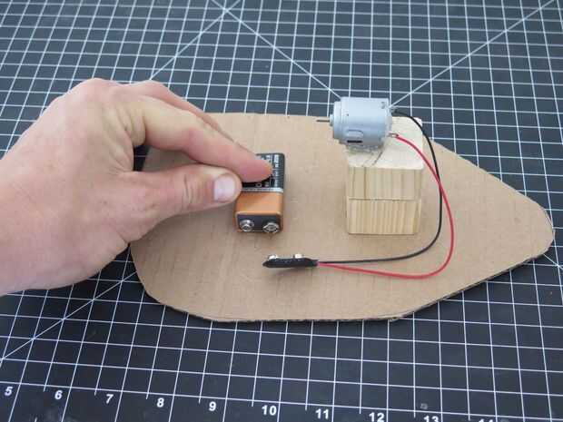 Enganche la parte trasera de su motor con los cables por lo que se puede conectar una batería. En mi caso, usé una batería de 9V, que pegué en el chasis. Para el cableado, he utilizado un cable de la batería de 9V que encaje justo en la parte superior. Usted puede obtener estos motores para funcionar incluso con una sola batería AA o AAA, así que siéntase libre de experimentar con cableado gancho-ups.