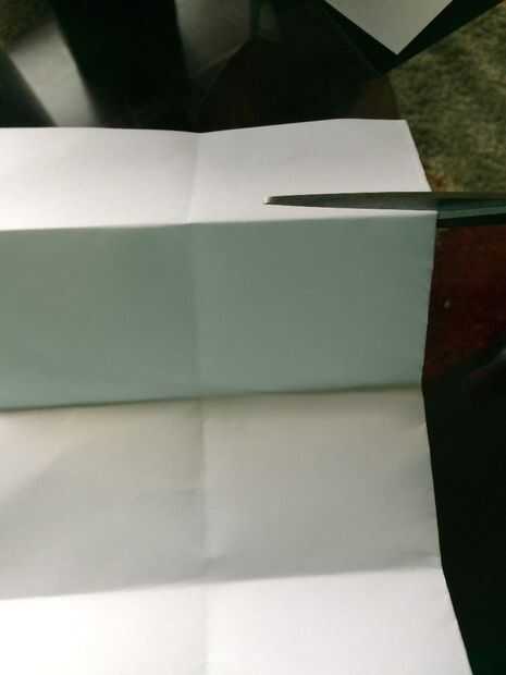 Doblar a lo ancho la mitad como lo hizo en el segundo paso. Luego corte el extremo cerrado de horizontalmente en los dobleces para una longitud de 1 plaza. Debe acabar como la imagen 2.