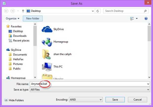 En segundo lugar, el nombre del archivo lo que quieras, pero después el nombre tipo .bat