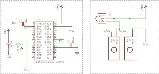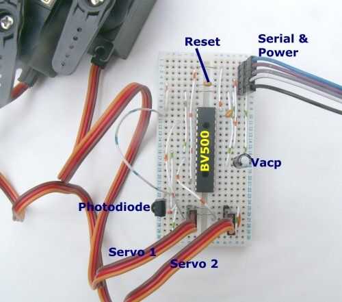 El fotodiodo IR y los servos requieren 5V, sin embargo para probar ambos trabajarán en 3v3. No recomiendo usar dos servos en el 3c3 suministrados por una interfaz en serie sin embargo se trabaja muy bien para la prueba.