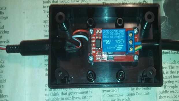 Sobre el relé: cuando escribí esto, estas placas prefabricadas relé había llegado a ser bastante común y de un montón de diferentes proveedores, listos para conectar a tu microcontrolador favorito. El tomé tiene una característica llamada "optoisolation" que significa que el alto voltaje es eléctricamente aislado de los cables que se remonta a su microcontrolador. (Ver Wikipedia para un gran artículo). Si usted no puede conseguir este módulo exacto, sugiero que usted pide lo que puede con las mismas características y luego encontrar una caja de proyecto a ajustarse.