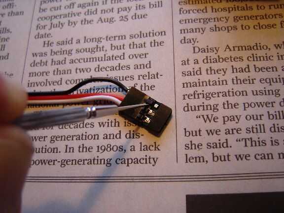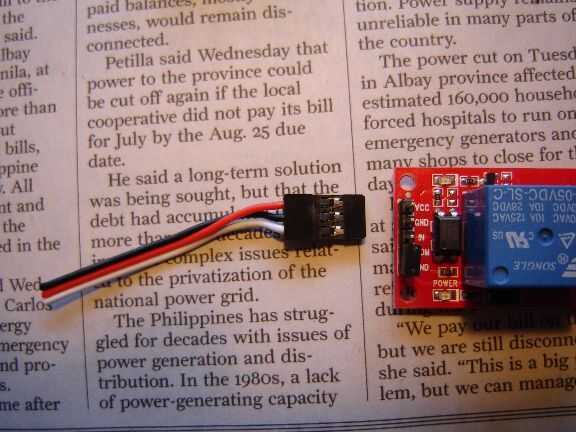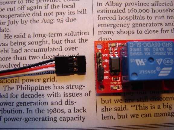 Las conexiones en los siguientes pasos siguen los colores, y esto hace fácil conectar el microcontrolador (y solucionar problemas si es necesario). Pero... Compruebe las conexiones en el relé. Si te fijas bien en la foto, verás que esta placa de relé específico no sigue el patrón que los cables rojo, negro y blanco! Tuve que usar un destornillador muy pequeño y levante los dedos en un extremo del conector servo para rojo y negro, tirar de ellos, intercambiar sus posiciones. Luego corte el cable del conector del servo para que tenga aproximadamente 3" de alambre que se extiende desde el enchufe.