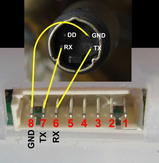 Recomiendo usar un cable de 3 pines (se pueden comprar lotes en ebay). Las clavijas de tres relevantes en el Brainlink están en el lado izquierdo del puerto de 8 pines: GND, serie TX y RX serial. Así que si utiliza un cable de 3 pines, será sólo enchufa en el lado izquierdo del puerto. Si utiliza un cable de 8 pines, recomiendo los otros cinco alambres cerca del conector de corte, o que cubren los extremos con cinta aislante para evitar cortocircuitos.