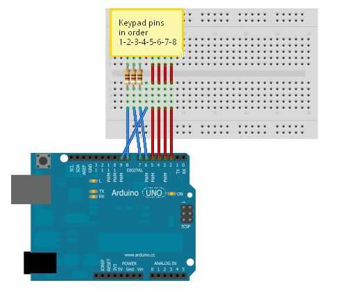 Ahora debe poner tres resistencias 910 ohms en el pin 1, 2 y 3 del teclado, luego poner en los pines digitales de arduino de la siguiente forma: