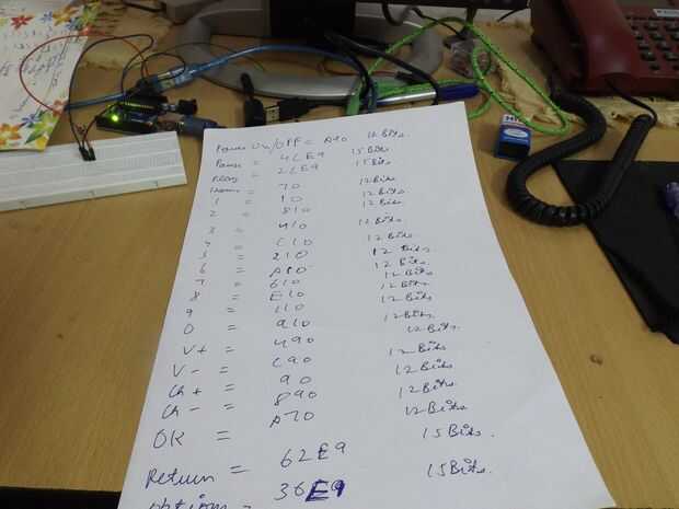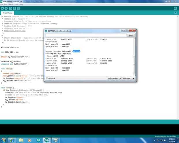 Anote el valor y el número de bits mencionados en el serial monitor para cada botón único. Fotos y capturas de pantalla de ayuda. Valor puede ser en números o alfabetos como A90, 2CE9 etc.. Y el valor en bits etc. 12,15. Nota sólo las que desea utilizar con su teléfono significa que sólo los más útiles.