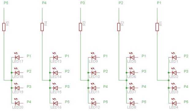 En mi caso, quería que el LED en lotes de 3, así que diseñé como la primera imagen. Finalmente sacó LED 18, 19 y 20 para que funcione. Mientras estaban en el circuito, 4 LED se ilumina al mismo tiempo. Que terminé tener que comprar nuevo LED para conseguir esta funcionando correctamente.