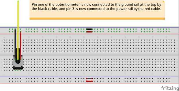 Ahora empuje los pines del potenciómetro en el protoboard como se muestra en el diagrama