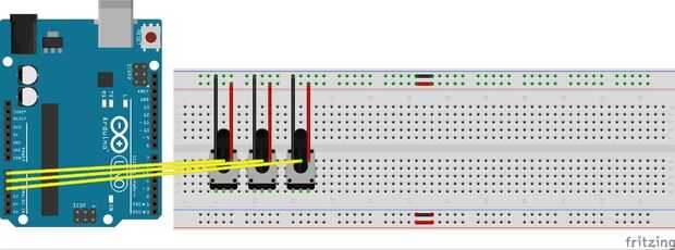 Ahora tomamos los cables de señal amarillo y conecte a la placa Arduino. Mire cuidadosamente el Arduino y vemos una parte de la junta llamada analógica en. Nos conectar nuestros cables en A0, A1 y A2 como se muestra en el diagrama.