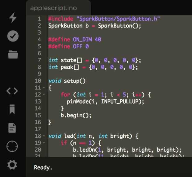 Los botones en el escudo de núcleo de la chispa de "botón de internet" se enganchan para arriba D1-D4. Puedes subir este bosquejo en GitHub el sitio web de spark.io y luego la flash a la placa con el rayo (arriba izquierda). Esto tendrá el núcleo de la chispa supervisar los botones y emitir eventos cuando uno o todos botones son liberados después de ser presionado. (Sólo 2 o 3 teclas y soltando no se disparará un evento, esto es deliberado).