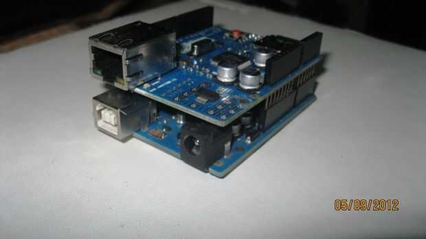 Ahora la pila tu escudo de Ethernet en la placa Arduino UNO como en la foto adjuntada.