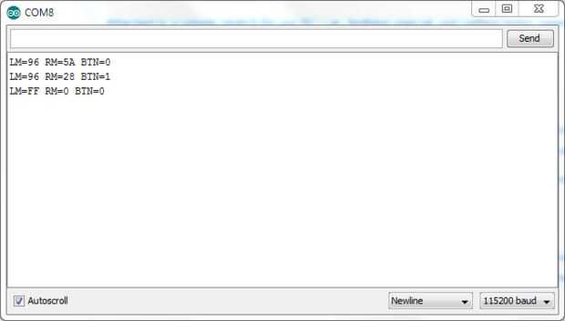 En primer lugar, subir el sketch de arduino. Puede probar si funciona abriendo a un Monitor serie a 115200 bod y envío de datos manualmente. Mensaje por ejemplo "100 100 1 0" es un equivalente de 100 pasos hacia adelantados (motores izquierdos y derecho) sin pulsar los botones de movimiento. En respuesta debe obtener cadenas, que se muestra en la imagen superior.