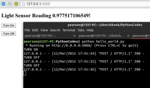 from flask import Flask, render_template,request, redirect, url_forapp = Flask(__name__) # we are able to make 2 different requests on our webpage # GET = we just type in the url # POST = some sort of form submission like a button methods = ['POST','GET']) def hello_world(): # variables for template page (templates/index.html) author = "Kyle" readval = 10 # if we make a post request on the webpage aka press button then do stuff if request.method == 'POST': # if we press the turn on button if request.form['submit'] == 'Turn On': print 'TURN ON' # if we press the turn off button elif request.form['submit'] == 'Turn Off': print 'TURN OFF' else: pass # the default page to display will be our template with our template variables return render_template('index.html', author=author, value=100*(readval/1023.)) if __name__ == "__main__": # lets launch our webpage! # do 0.0.0.0 so that we can log into this webpage # using another computer on the same network later app.run(host='0.0.0.0') Cuando se ejecuta este programa debería obtener una salida similar a la imagen de arriba. Asegúrese de conectar a la web en tu navegador en http://127.0.0.1:5000 / después de ejecutar el python script (y siga funcionando!) Jugar con los botones y comprobar que está recibiendo a imprimir algo en el terminal.
