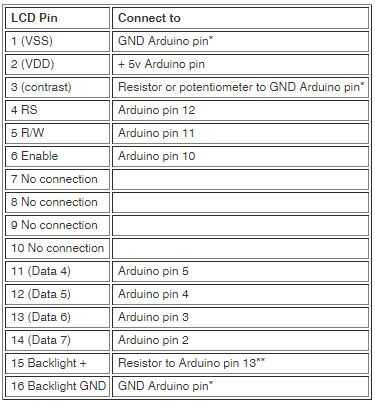 Esta es la parte más delicada para el cableado de este proyecto. La tabla de arriba muestra cómo cada conexión de la pantalla LCD se conecta al Arduino. Es mucho más fácil configurarlo utilizando un carril de la placa positiva/negativa, sin embargo no tengo uno disponible. En mi instalación que he utilizado un potenciómetro entre tres pin y pin 1 porque permite fácilmente ajustable luz de fondo. Sin embargo esto no es necesario y un resistor de 10K funciona en su lugar.