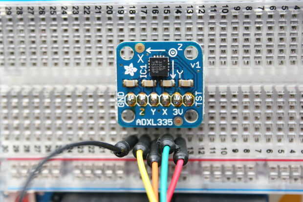Cuidado con: El poder de la ADXL335 es 3.3V.  Conectarlo a 5V matará él.