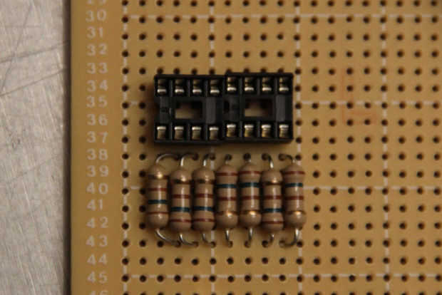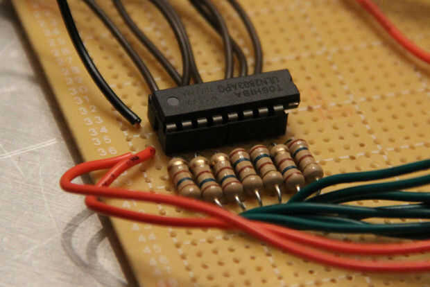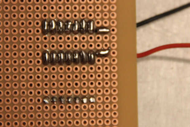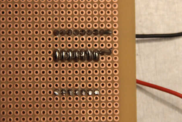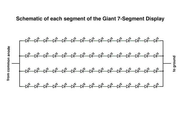 Displays de 7 segmentos de tamaño normales constan de 7 leds rectangulares dispuestos de modo que pueden mostrar los números 0-9. Iluminar un segmento de un display de 7 segmentos normal es equivalente a iluminar un LED, requiere aproximadamente 3V y 20mA; Esto se logra fácilmente por el Arduino solo. Este segmento siete gigantes es un poco diferente porque cada uno de los segmentos consiste de 4 series paralelas de 15 cables de LEDs rojos en serie (Fig. 2). Para encender el LED, el voltaje a través del segmento debe ser 15 * (voltaje de cada LED delantero) y la corriente a través de cada segmento es 4 * (corriente de cada LED de trabajo típica). Esto sale 31.5V(15*2.1V) y 80mA(4*20mA) por el segmento, claramente el Arduino no será capaz de manejar esto por su cuenta.