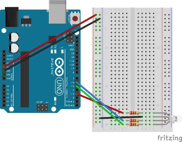 • Conecte las clavijas rojo, verde y azul a los pines digitales 3, 5 y 6 respectivamente.