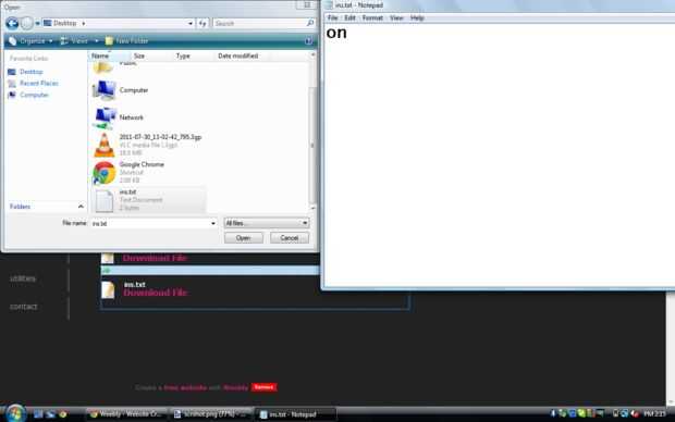 Sólo abrir el navegador y entrar en su cuenta de weebly. Editar el sitio donde subiste el archivo 'ins.txt'. Haga clic en el ins. Haga clic y el archivo Txt subir un nuevo archivo. Hacer otro ins.txt de archivo en el escritorio, esta vez con la palabra 'on'. No subirlo aún...