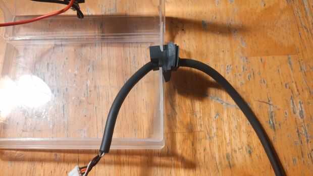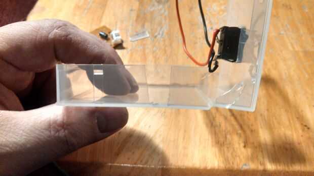A continuación corté una muesca en el lado de la caja para el alivio de tensión de cable. El alivio de tensión tenía una hendidura poco profunda que encaja en una muesca de plástico en el caso de teclado original. Tomó cuidado de cortar la muesca de manera similar en mi caso de cinta de modo que el alivio de tensión se mantiene en su lugar con un simple "ajuste de fricción"