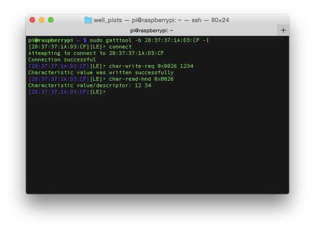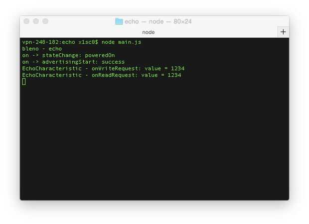 Este comando lee el valor que último enviados (que en este caso debe ser "1234") a la manija 0x0026. Podemos comprobar que la solicitud es recibida por mirar los mensajes de depuración de nuestra aplicación Bleno . En nuestro caso, la aplicación imprime "EchoCharacteristic - onReadRequest: valor = 1234" después de recibirla!