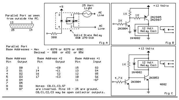 Aquí hay tres ejemplos de control de un relé desde el puerto de impresora paralelo de la PC (LPT1 o LPT2). La figura A muestra un relé de estado sólido controlado por una de las líneas de datos del puerto paralelo (D0-D7) con una fuente de alimentación 300 ohmios resistencia y 5 voltios. Se energizará el relé de estado sólido cuando se escribe un "0" en la línea de datos. Figura B y C muestran relés mecánicos controlados por dos transistores. Se energiza el relé de la figura B cuando se escribe un "1" en la línea de datos y el relé en la figura C es energizado por escribir un "0" a la línea. En cada uno de los tres circuitos, se realiza una conexión común del lado negativo de la fuente de alimentación a uno de los pines de tierra de puerto (18-25).