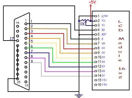 Circuito de LCD. (ver imagen), ver http://electrosofts.com/parallel/lcd.html para más detalles.