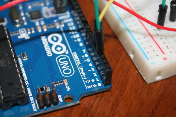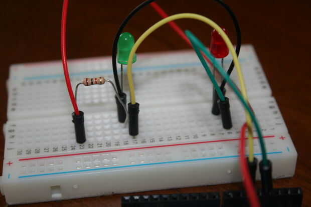 Configurar tu placa para que los lados de la cathode(negative) de los LEDs están conectados a una resistencia y luego a un terreno común. Haciéndolo de esta manera significa que sólo necesitamos un solo resistor y el conector de tierra. Las otras patas (positivo) de los LEDs deben ser en patillas 5 el LED verde y 3 para el LED rojo. Bueno ahora tenemos los LEDs conectados a nuestro arduino. Ahora vamos a ir en la codificación de