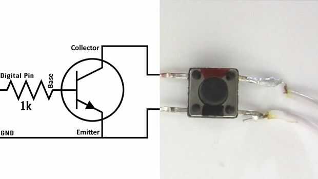 Pero aquí está un breve resumen. El botón "Probar mi" activa animación de apoyo por un perno en el circuito de control de atrezzo de conexión a tierra. Puede simular el pulsador conectando un transistor en paralelo con el interruptor. Cuando tu Arduino envía una señal de alta en la base del transistor, conecta los terminales del interruptor y activa la animación de la prop. Sólo asegúrese de que conecte la tierra del Arduino a la tierra del apoyo. Usted puede comprobarlo con un polímetro