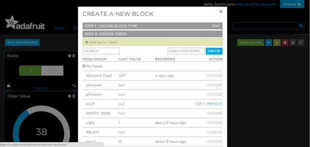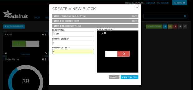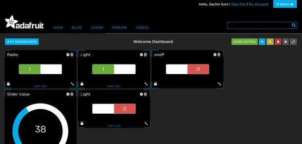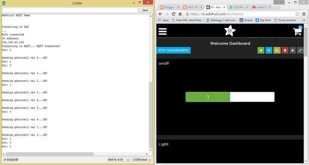 Ejemplo ahora abierto en el IDE de Arduino el nombre de "mqtt_esp8266". Solo tienes que cambiar el nombre ssid, contraseña para acceso a internet y también proporcionar a su agente de usuario y contraseña (clave de AIO). Y de solo subir el programa porque en el bosquejo de ejemplo, ha suscrito ya al onoff de tema así que no hay necesidad de cambiar nada en esta. Que el monitor serial abierto y dashboard adafruit de lado a lado (imagen 12).